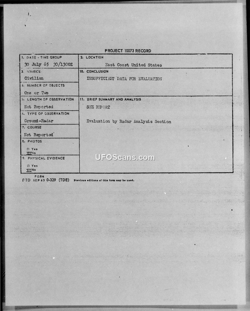 A 1965 UFO sighting report over the US East Coast was evaluated by the Air Force's Electronics Directorate. They concluded the data was insufficient but suggested the radar returns were likely caused by anomalous atmospheric propagation.