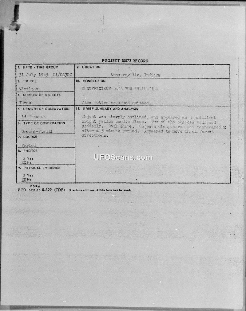 Project 10073 Record — Connersville, Indiana, 31 July 1965