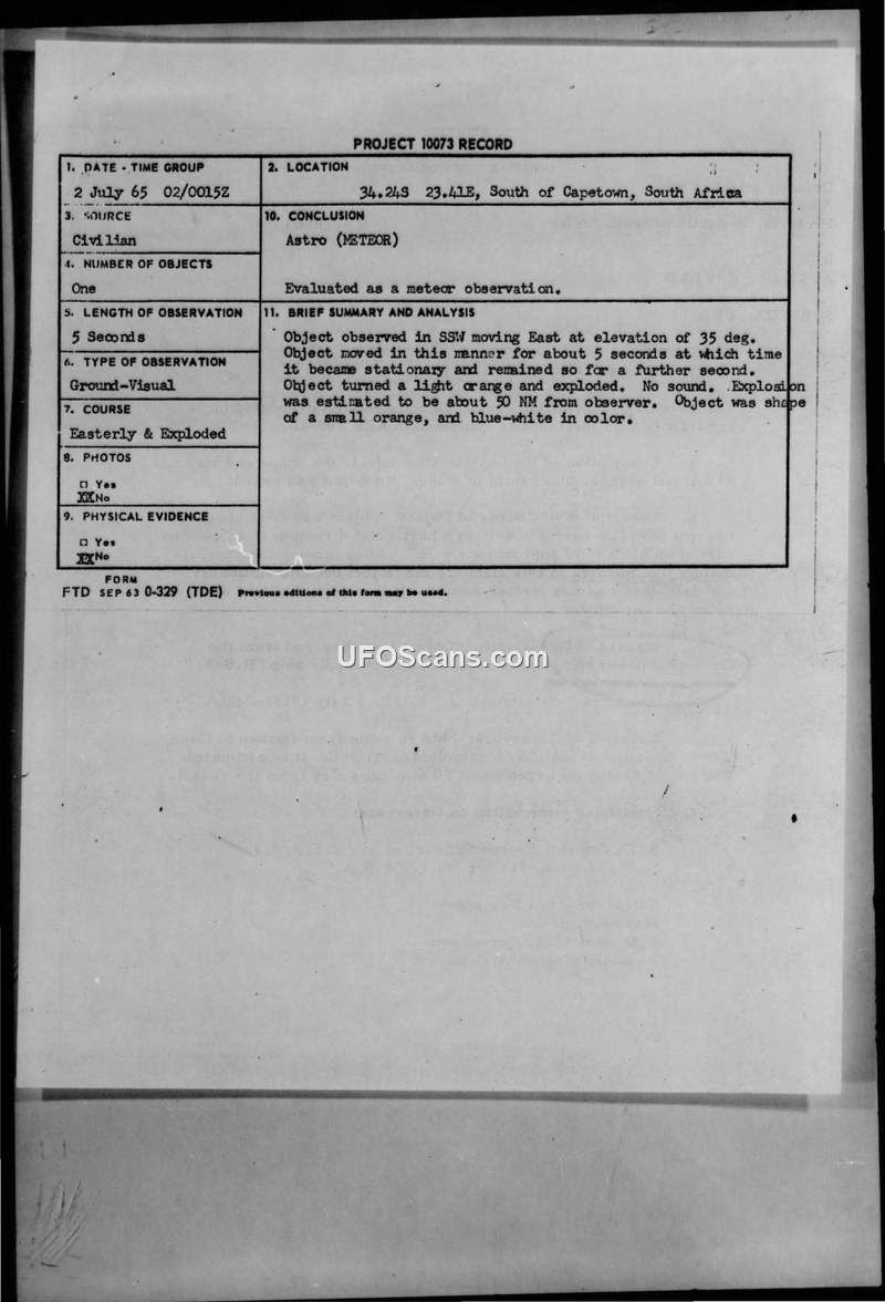 UFO Sighting Report - 2 July 1965, South of Capetown, South Africa