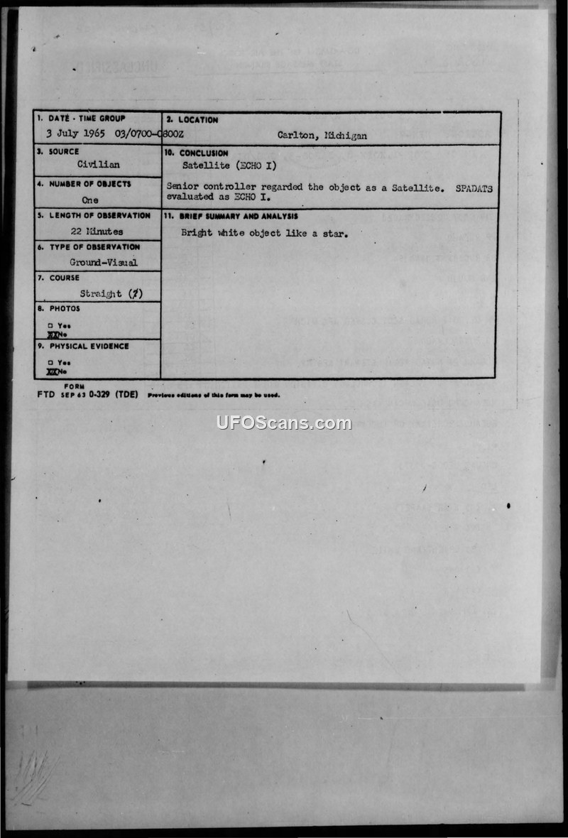 A civilian sighting of a bright, star-like object in Carlton, Michigan, on July 3, 1965, was officially identified by SPADATS as the Echo 1 satellite.