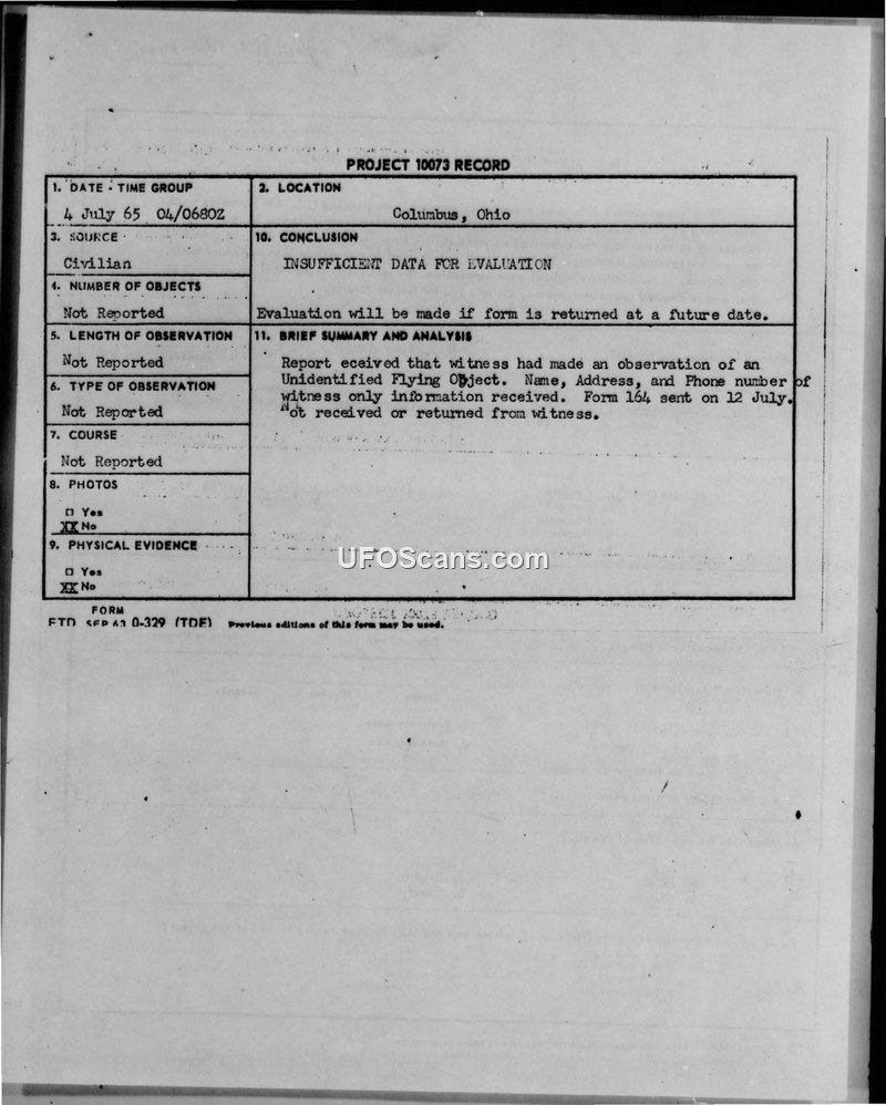A civilian reported a UFO sighting in Columbus, Ohio, on July 4, 1965. The Air Force attempted to collect data via a formal questionnaire, but the witness failed to return it, resulting in a case closure due to insufficient data.