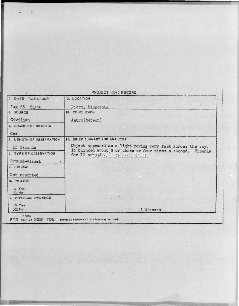 A civilian report from August 1965 describes a fast-moving, blinking light observed in Pierz, Minnesota. Project Blue Book officially classified the sighting as a meteor.