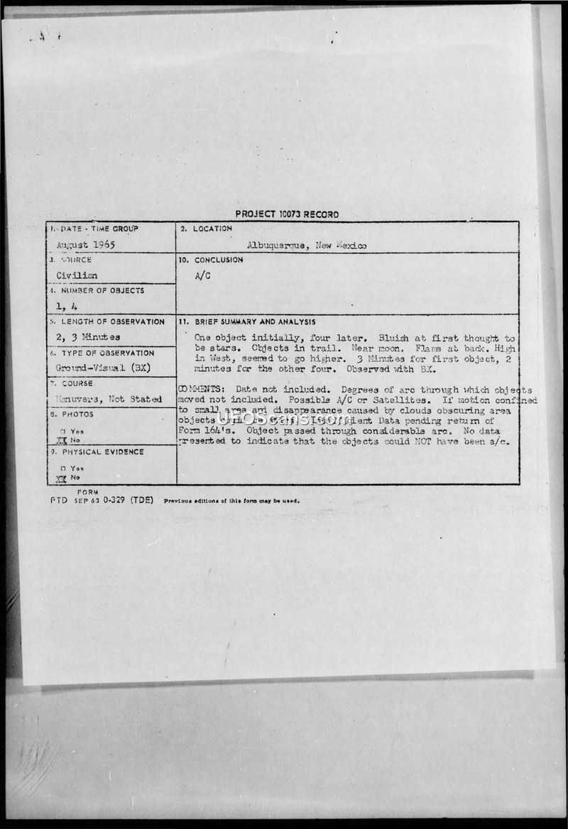 Project 10073 Record: Compilation of UFO Reports, Albuquerque, New Mexico, August 1965
