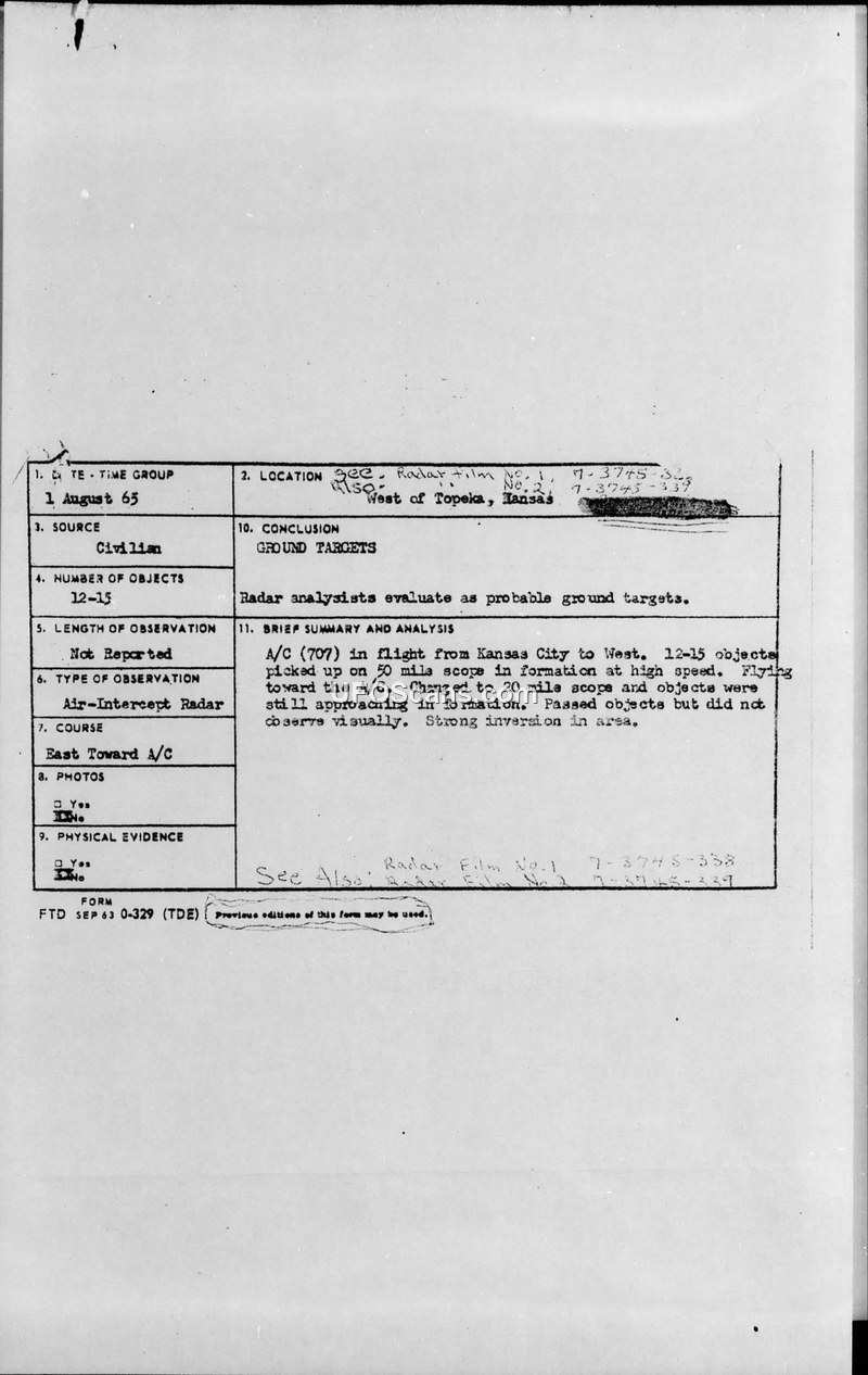On August 1, 1965, a TWA aircraft (a 707) flying from Kansas City toward the West Coast encountered an unidentified radar phenomenon. While in the vicinity of Topeka and Garden City, Kansas, the flight crew—consisting of a pilot, co-pilot, and engineer—observed 12 to 15 objects on their radar scope. The objects were described as flying at high speed and in formation, moving toward the aircraft. The crew switched from a 50-mile scope to a 20-mile scope and continued to track the objects in formation. Despite passing the objects at a reasonable distance, the crew was unable to observe them visually. The crew, described as very reputable, requested that their names remain confidential and that the sighting receive no publicity. The incident was reported to the Foreign Technology Division of the Air Force Systems Command. Following an evaluation of the radar data and the circumstances, the Air Force concluded that the objects were likely false targets. The official explanation attributed the radar returns to anomalous propagation, specifically the bending or reflecting of radar waves caused by atmospheric "bubbles" or strong temperature inversions in the area. The case file includes radar film documentation.