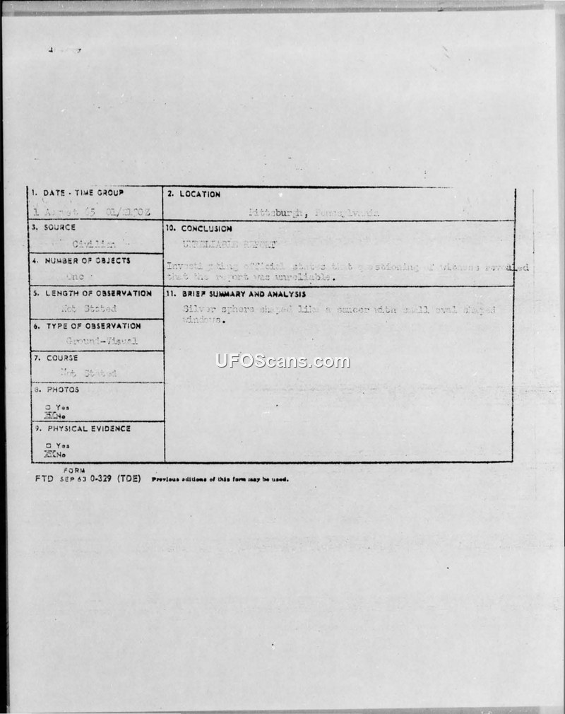 This document is a compilation of reports and correspondence regarding a series of Unidentified Aerial Phenomena (UAP) sightings in the Pittsburgh, Pennsylvania area during July and August 1965. The 911th Troop Carrier Group, based at Greater Pittsburgh Airport, documented numerous reports from local residents describing various objects, including cigar-shaped craft with red exhaust, oval-shaped orange discs, and silver spheres. The reports were forwarded to the Air Force Systems Command (AFSC) at Wright-Patterson AFB for evaluation under Project 10073. The military investigation concluded that the majority of these reports were unreliable, potentially hoaxes, or misidentifications. Specifically, investigators identified several sightings as being caused by a Citabria advertising plane owned by AAA Sky Adds, Inc., which was equipped with a framework of lights that could spell messages and, when viewed from certain angles or in misty conditions, appeared as a silent, rotating, disc-shaped object. Other sightings were attributed to weather balloons, meteor showers, or the satellite Echo II. The document includes detailed logs of individual sightings, observer contact information, and meteorological data for the relevant dates. The Information Officer, Eugene F. Fehrer, noted that intense media publicity had significantly increased the volume of reports, necessitating the use of standardized forms to collect data for further investigation. Despite the high volume of reports, the official conclusion remained that the phenomena were either identified as conventional aircraft or lacked sufficient data for a definitive evaluation.