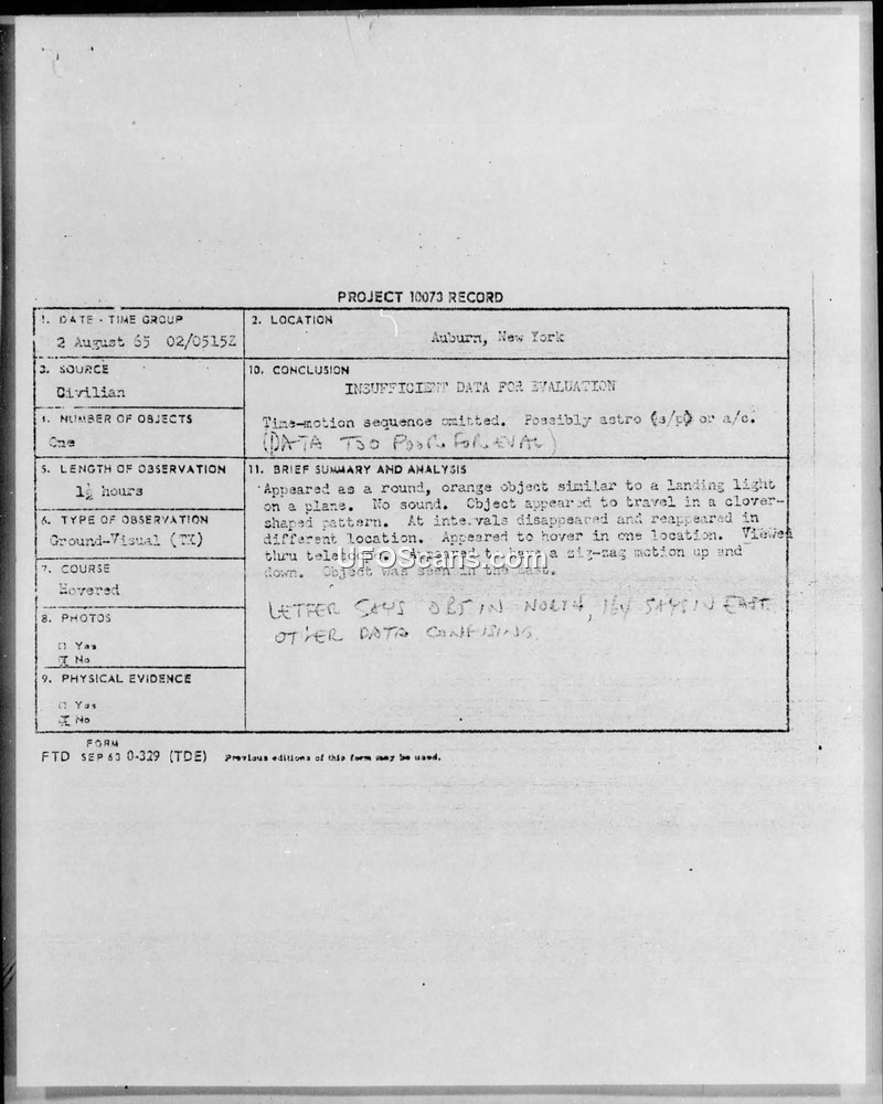 Project 10073 Record — Auburn, New York, 2 August 1965