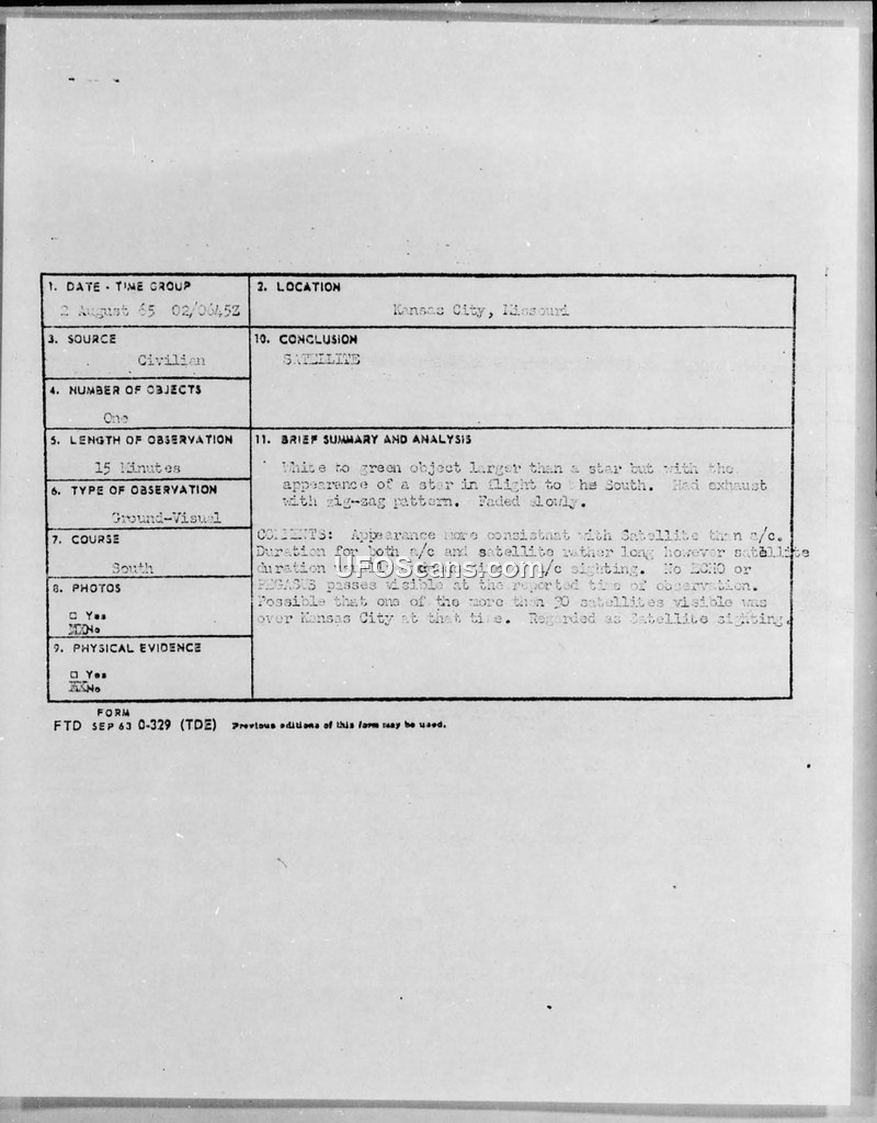 This document collection comprises a series of Project 10073 records and incoming Air Force messages detailing multiple UFO sightings reported in the Kansas City, Missouri area during August 1965. The reports involve various witnesses, including students and a police officer, who observed objects with diverse characteristics. Some sightings, such as those lasting several hours, were evaluated as astronomical phenomena, specifically the planets or stars Mars and Antares. Other reports described objects exhibiting rapid, erratic, or 'haphazard' movements, including zig-zag patterns and diamond-shaped formations, which witnesses claimed were inconsistent with standard aircraft. Despite the detailed descriptions provided by witnesses—ranging from 'extremely bright' lights to objects the size of a pencil—the Wing Intelligence Officer, Major F. C. Faust, consistently concluded that with the information available at the wing level, no definitive analysis could be made regarding the possible cause of these sightings. The documents reflect the standard military procedure for documenting and reporting aerial phenomena during this period, utilizing the FTD 0-329 form and teletype message formats to relay information to the Foreign Technology Division at Wright-Patterson Air Force Base and the Defense Intelligence Agency.