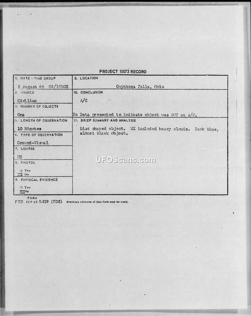 Project 10073 Record — Cuyahoga Falls, Ohio, 2 August 1965