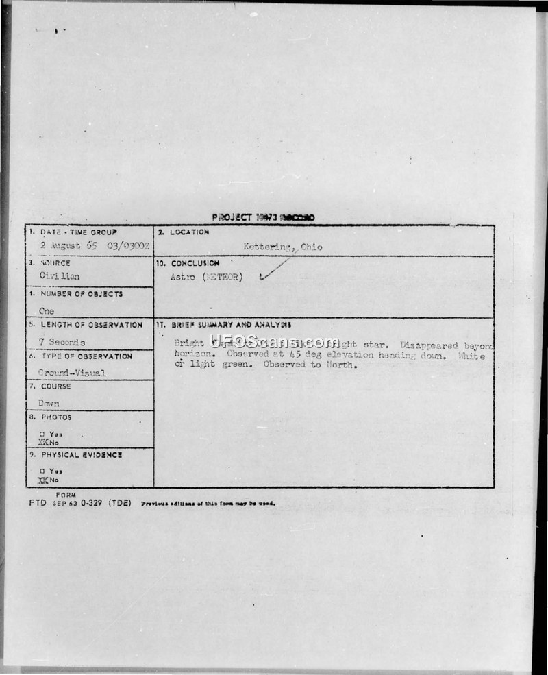 A civilian in Kettering, Ohio, reported a bright, flashing object on August 2, 1965. The U.S. Air Force investigated the incident and concluded the object was a meteor.