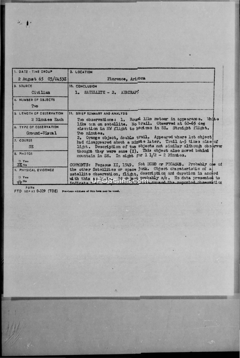 A civilian witness in Florence, Arizona, reported two unidentified objects on August 3, 1965. The Air Force concluded the objects were likely a satellite and an aircraft.