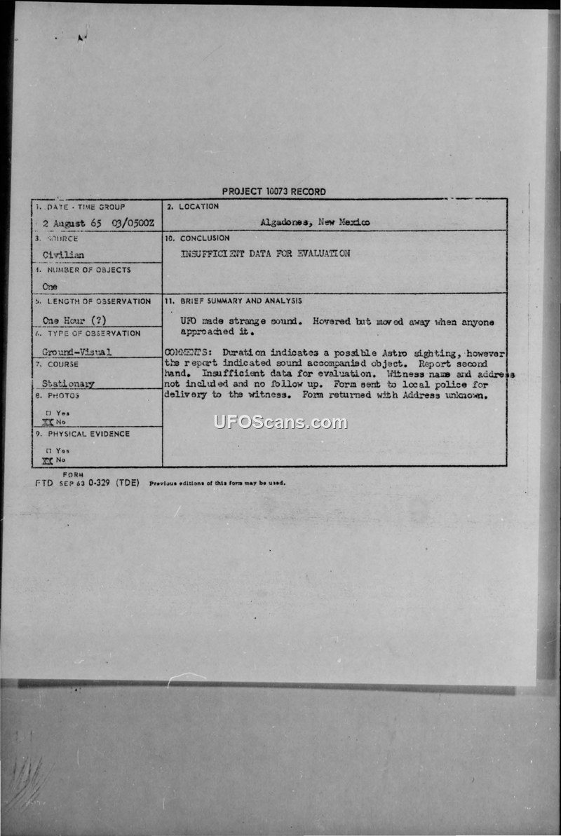 A 1965 UFO sighting in Algodones, New Mexico, was deemed insufficient for evaluation due to the second-hand nature of the report and the inability to contact the witness. The Air Force attempted to follow up with local law enforcement, but the correspondence was returned as undeliverable.