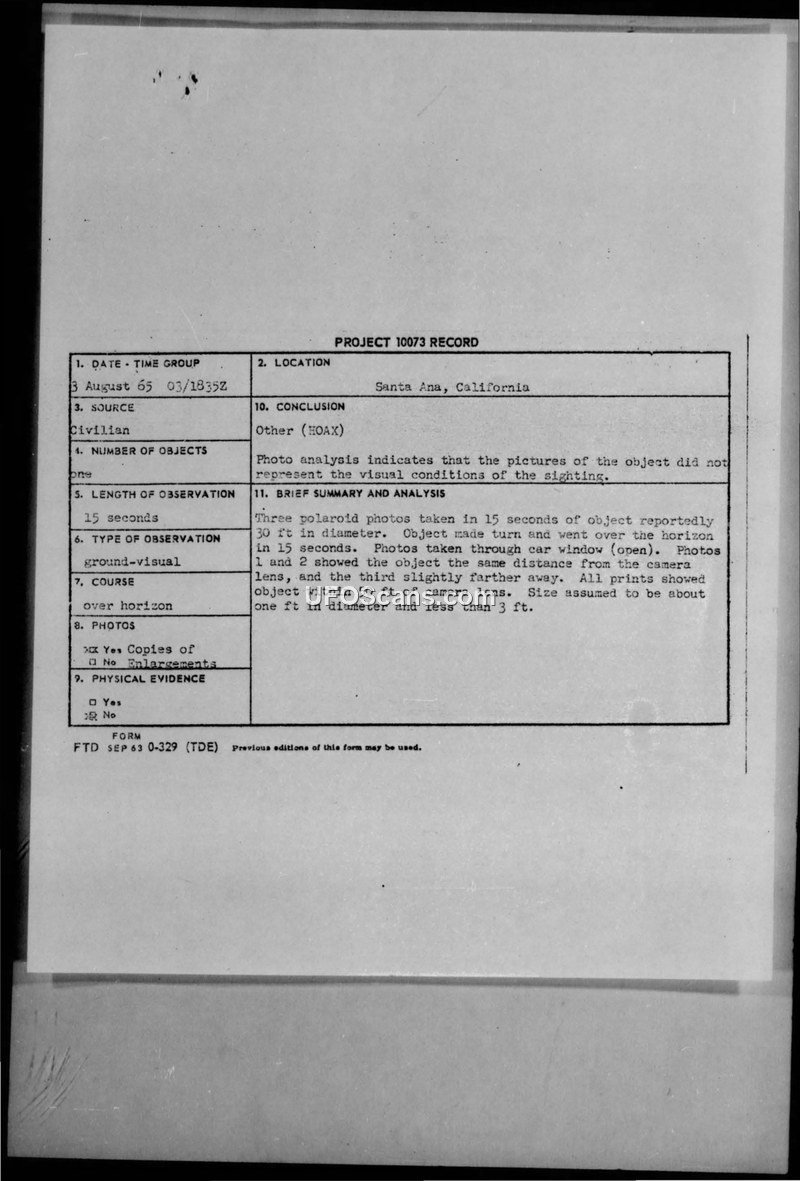 This document is a comprehensive record of the investigation into a UFO sighting reported by Rex Heflin, a traffic investigator for the Orange County Road Department, on August 3, 1965, in Santa Ana, California. Heflin claimed to have observed and photographed a silver, circular object, approximately 30 feet in diameter, while driving on Myford Road. He reported that the object hovered, tilted, and then accelerated away, all within a 15-second period. Heflin took three Polaroid photographs of the object through his vehicle window. The investigation, conducted by Captain Charles F. Reichmuth of the Space Systems Division, involved multiple agencies, including the Marine Corps at El Toro and the Foreign Technology Division (FTD). The report details the chain of custody for the original photographs, which were passed between various military and civilian entities, including NORAD and the press, often without receipts. The investigation faced significant challenges, including discrepancies in Heflin's testimony and his reluctance to answer specific questions regarding the delay in reporting the sighting and the source of his prints. The FTD conducted a photo analysis, which concluded that the images did not match the reported visual conditions. A controlled test using a small, 9-inch object tossed in the air produced similar photographic results, leading investigators to conclude that the incident was likely a hoax. Despite these findings, the case generated significant media attention, with articles appearing in the Herald-Examiner and The Register. The document includes various internal memos, investigation reports, and copies of the press coverage, all documenting the military's attempt to verify the authenticity of the photographs and the eventual conclusion that the sighting was not genuine.