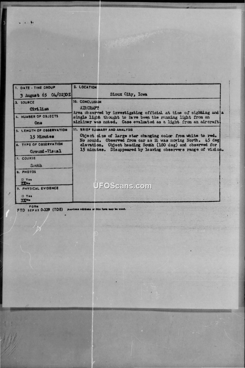 UFO Sighting Reports — Sioux City, Iowa, August 1965