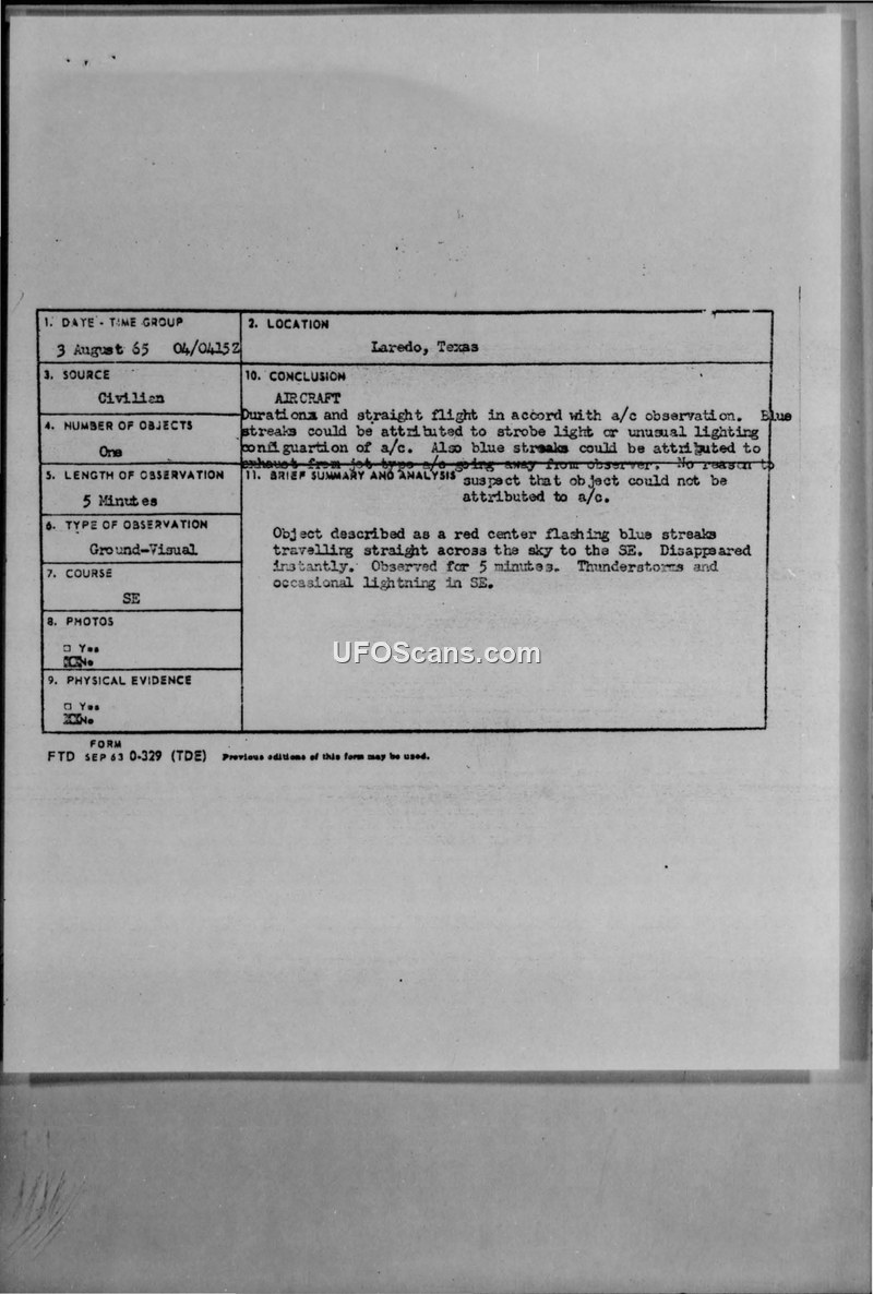 A series of UFO sightings in Laredo, Texas, in August 1965 were investigated by the Air Force and attributed to astronomical bodies, aircraft, and weather phenomena.