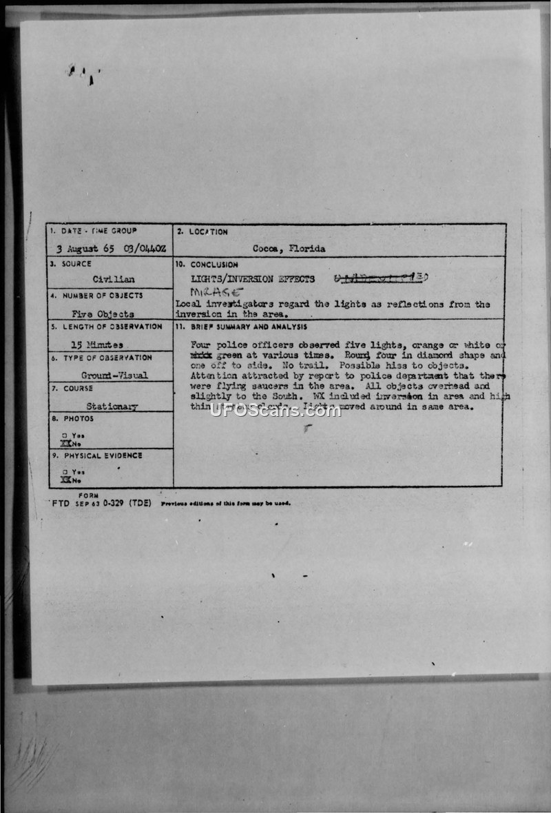 Four police officers in Cocoa, Florida, reported observing five unidentified lights in a diamond formation on August 4, 1965. The Air Force officially attributed the sighting to reflections caused by a temperature inversion, though the witnesses maintained the objects were distinct from stars or reflections.