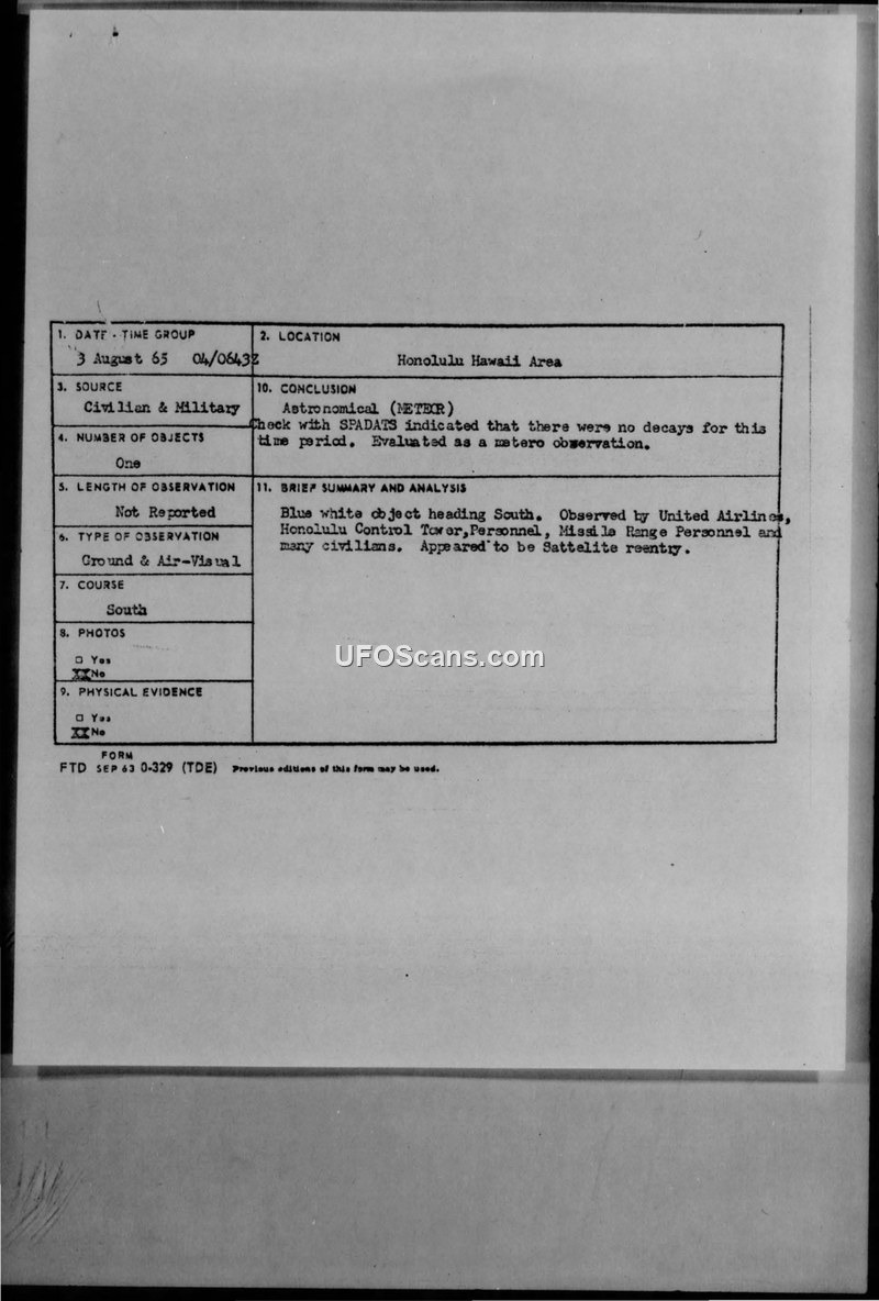 U.F.O.'s in Hawaii - 2 August to 5 August 1965