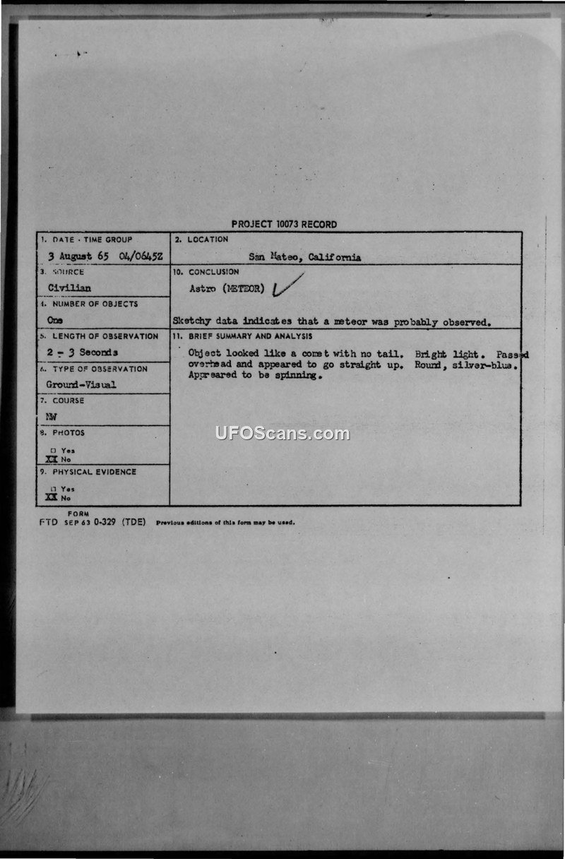 Project 10073 Record: UFO Sightings, August 1965