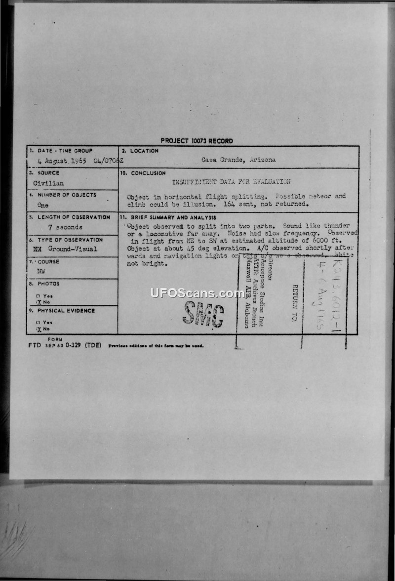 A 1965 UFO sighting report from Casa Grande, Arizona, involving a witness who observed two objects splitting in flight. The Air Force concluded the report contained insufficient data for evaluation.