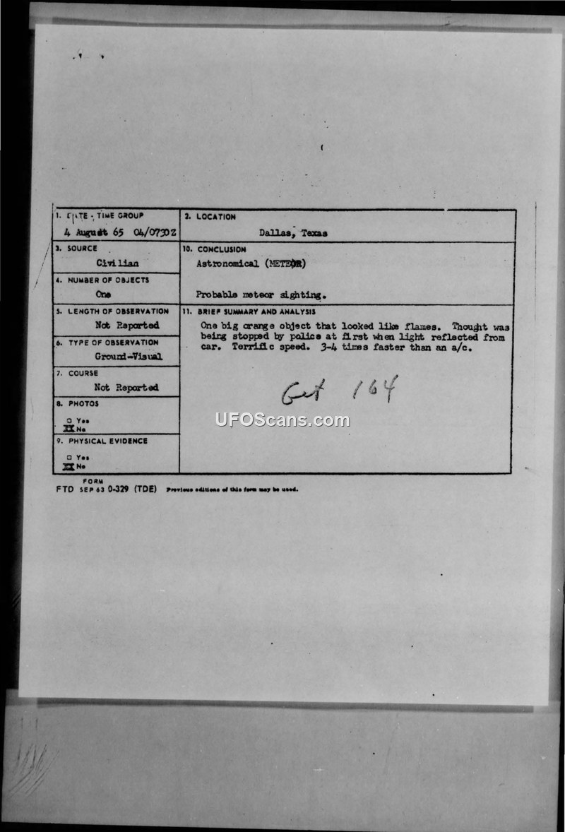 A 19-year-old witness in Dallas reported a high-speed, orange, flame-like object on August 4, 1965. The Air Force investigation concluded the object was unidentified after ruling out meteors, satellites, and aircraft.