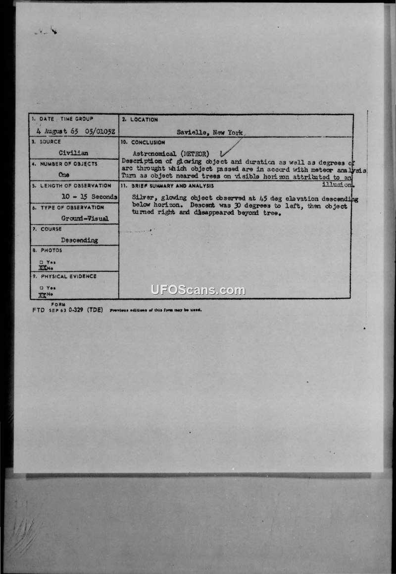 A 17-year-old witness reported a glowing, round object in Savielle, NY, on August 5, 1965. The Air Force concluded the sighting was likely a meteor and an optical illusion.