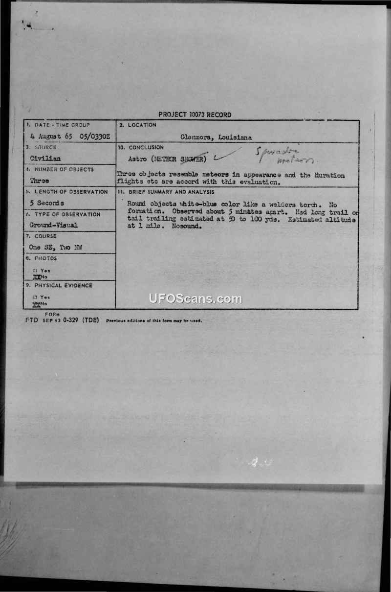 A civilian in Glenmora, Louisiana, reported three white-blue objects with long tails on August 4, 1965. The Air Force officially classified the event as a meteor shower, though intelligence officers acknowledged the possibility of high-altitude aircraft.