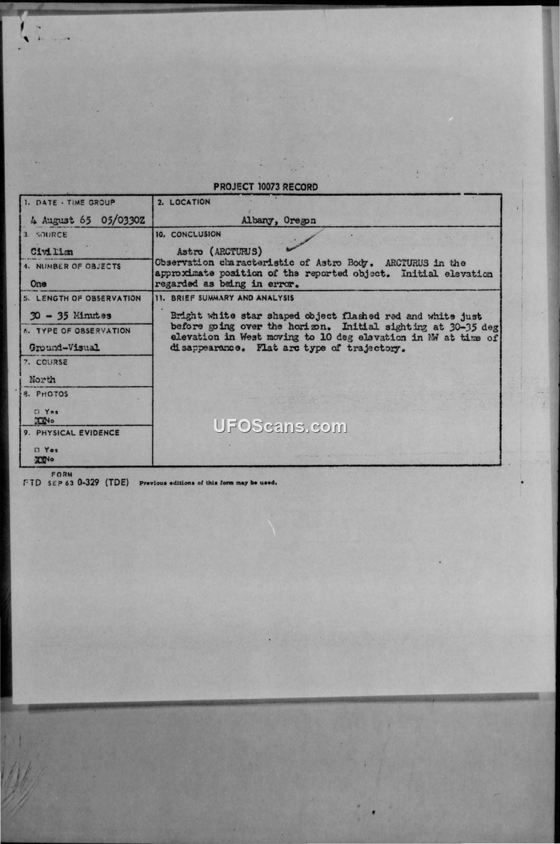 A civilian in Albany, Oregon, reported a 35-minute sighting of a star-like object on 4 August 1965. The Air Force investigation concluded the object was the star Arcturus.