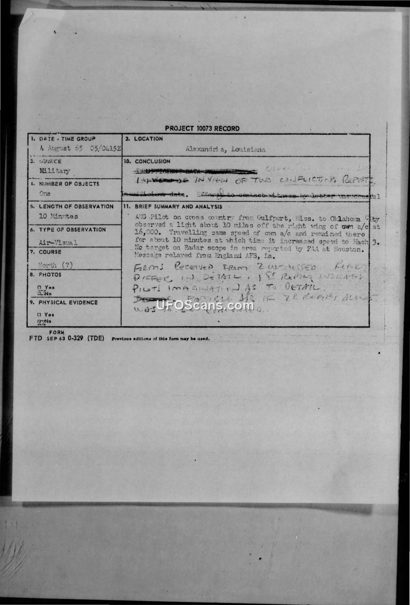 Project 10073 Record — UFO Sighting, 4-5 August 1965