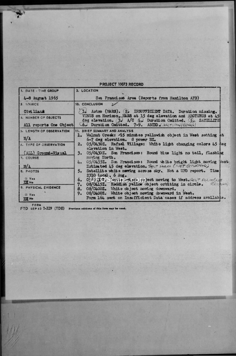 Project 10073 Record: San Francisco Area Sightings, August 1965