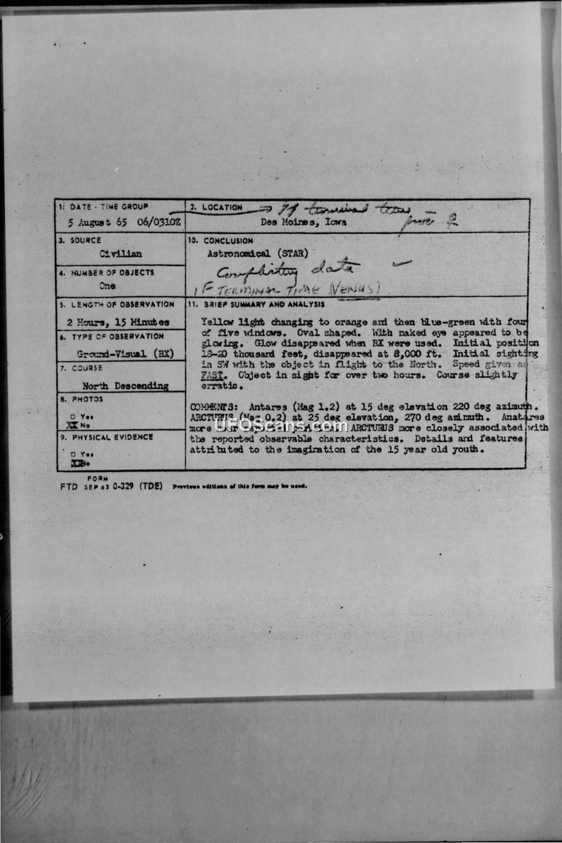 A 1965 UFO sighting report from Des Moines, Iowa, involving a 15-year-old witness. The Air Force concluded the object was likely the star Arcturus.
