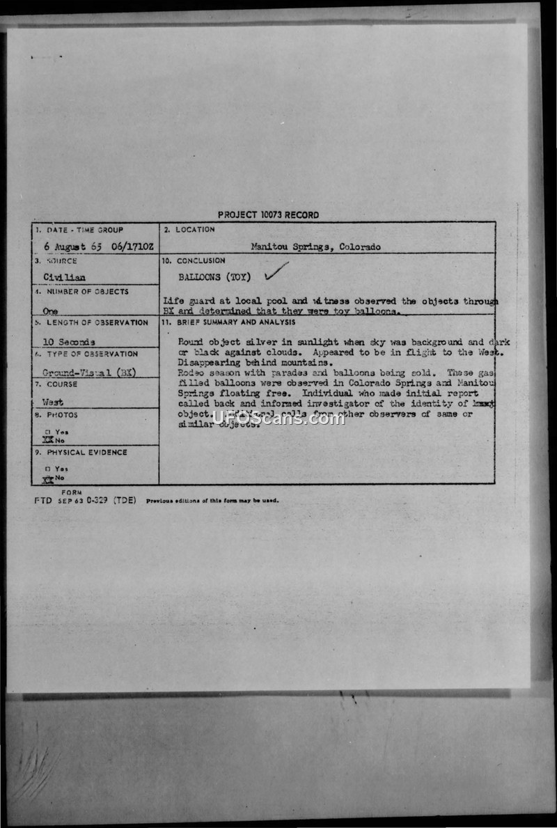 Project 10073 Record — Manitou Springs, Colorado, 6 August 1965