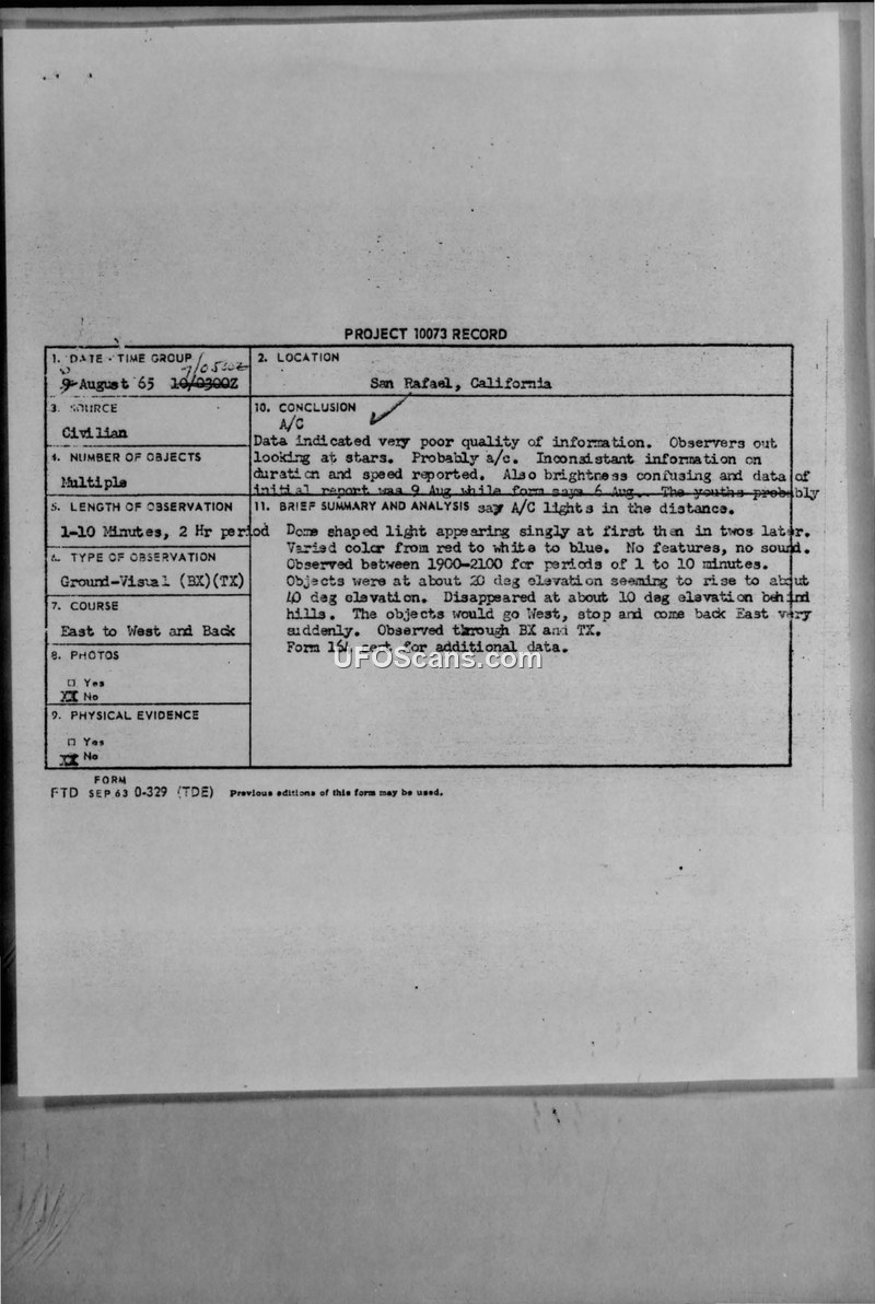 Project 10073 Record — San Rafael, California, 9 August 1965