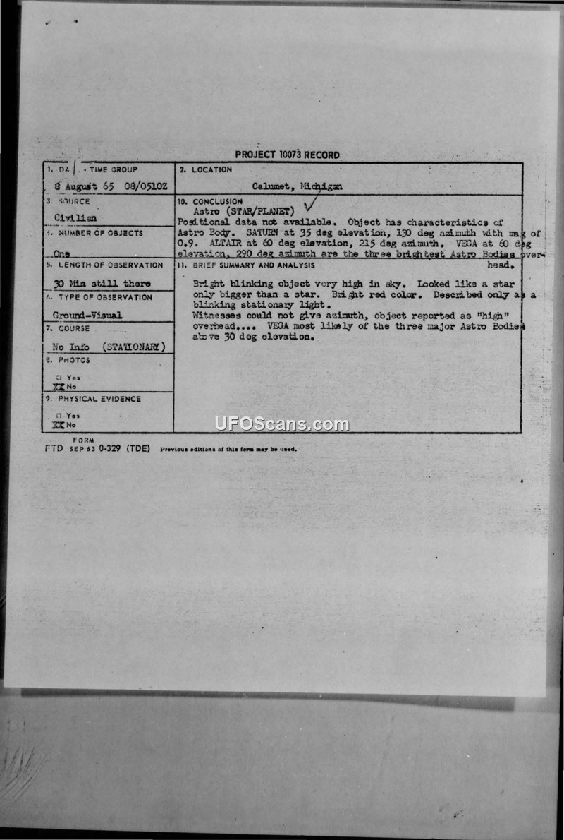 This document contains a series of incoming military messages and Project 10073 records regarding Unidentified Aerial Phenomena (UAP) sightings reported in Calumet, Michigan, in August 1965. The reports detail observations made by civilians and military personnel, including an Airman Third Class from the Calumet Radar Station. Witnesses described seeing a bright, blinking object that appeared larger than a star, with colors including red, green, and white. The object was reported to be at a high altitude, stationary, and occasionally revolving. The reports note that the object was observed for approximately 30 minutes. The Air Force investigation, led by the Chief of Intelligence, evaluated these sightings in the context of local weather conditions and known air traffic. The official conclusion reached was that the witnesses were likely observing high-altitude aircraft at night. The report suggests that the observers, being unfamiliar with such sightings, misinterpreted standard aircraft navigation lights and maneuvers. The document notes that three airways pass to the north of Calumet, and it is possible that aircraft were in the area during the time of the sightings. The investigation further suggests that the 'tadpole' shape and color descriptions were consistent with the appearance of aircraft navigation lights under specific viewing conditions, such as when an aircraft turns or performs maneuvers to meet a control time or ETA.