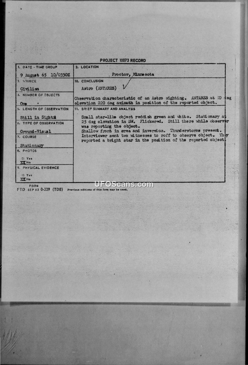 A 1965 UFO sighting in Proctor, Minnesota, was investigated by the Air Force and officially identified as the star Antares. The report was confirmed as the only UFO report from Minnesota during the period of 2-10 August 1965.