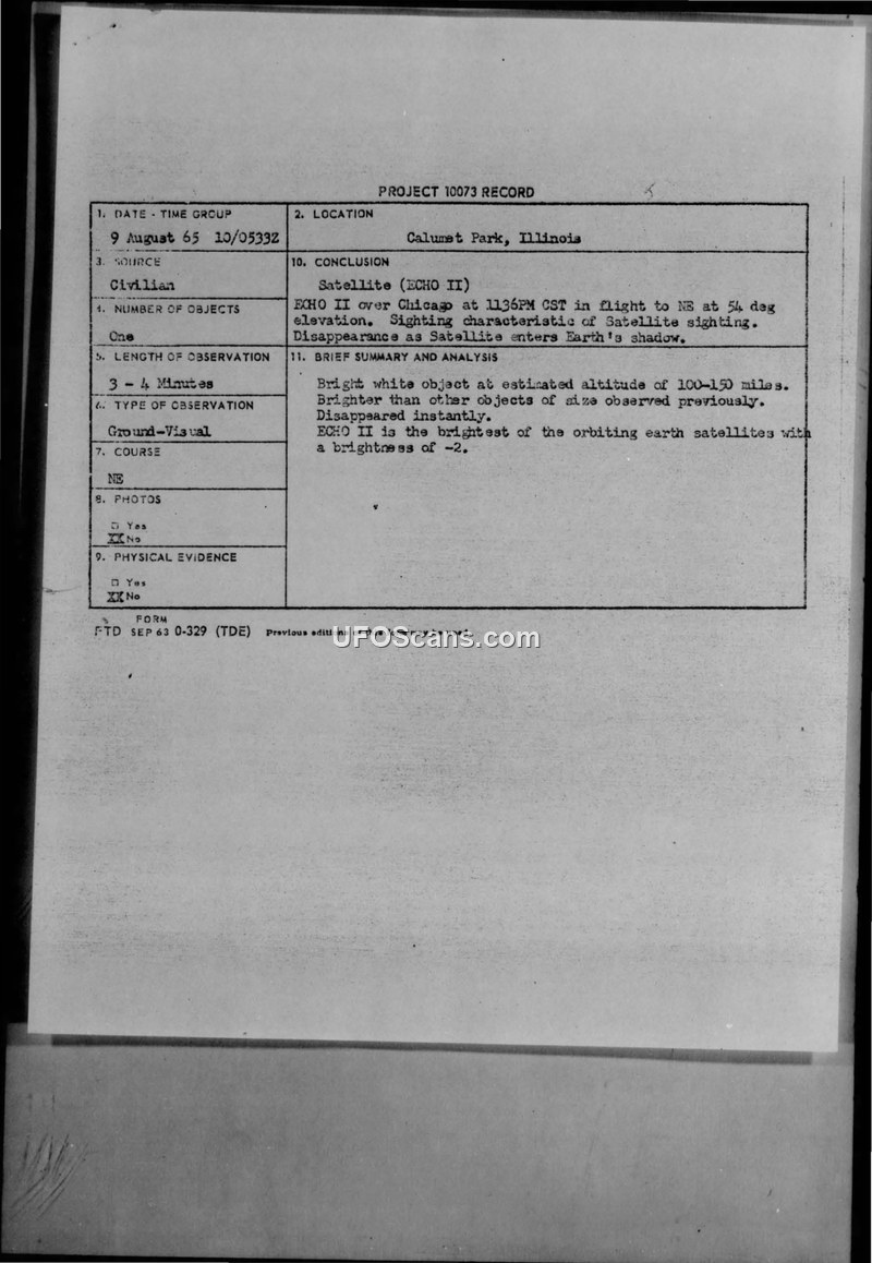 On August 9, 1965, at 11:36 PM CST, a civilian and his wife observed a bright white object while walking their dog in Calumet Park, Illinois. The witness described the object as circular, approximately the size of a pea, and noted it was more brilliant than any star or the moon. The object traveled from due South to due North, veering slightly to the East, and remained visible for three to four minutes before disappearing instantly. The witness reported no sound and noted that the sky was extremely clear, though thin clouds indicated strong high-altitude winds. Following the disappearance of the object, the witness observed a single contrail, which he believed suggested a jet aircraft. The incident was reported to the local Civil Defense and subsequently referred to Major Dixon and the 928th Troop Carrier Group. The official conclusion reached by the Air Force, as documented in the Project 10073 record, identified the object as the ECHO II satellite. The report notes that the sighting characteristics, including the object's brightness and its disappearance as it entered the Earth's shadow, were consistent with a satellite. Clayton W. Salmonson, the Base Flight Operations Dispatcher, noted that the witness appeared sincere and calm, and suggested that the witness's own estimation of the altitude supported the conclusion that he had observed the ECHO II satellite.