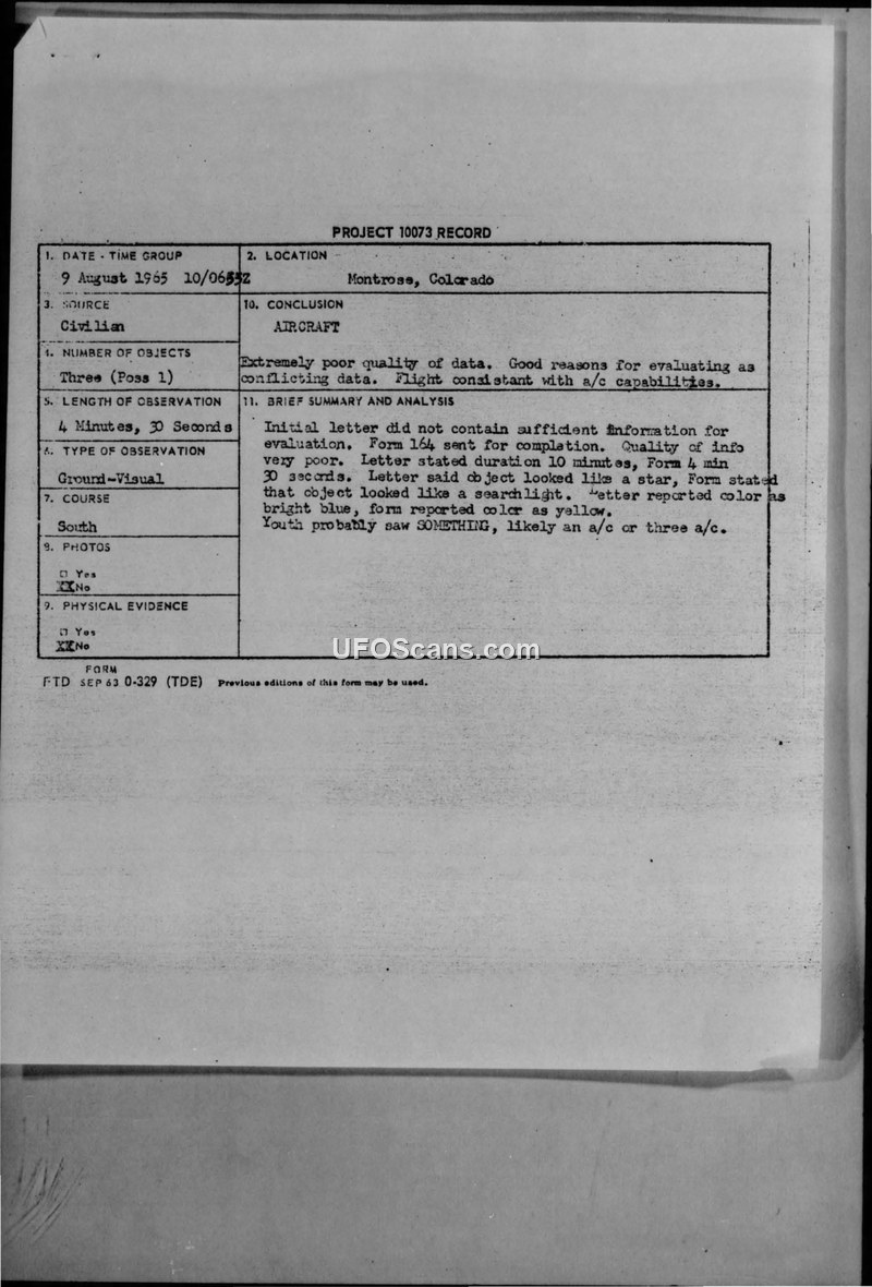 Project 10073 Record — Sighting Report, Montrose, Colorado, 9 August 1965