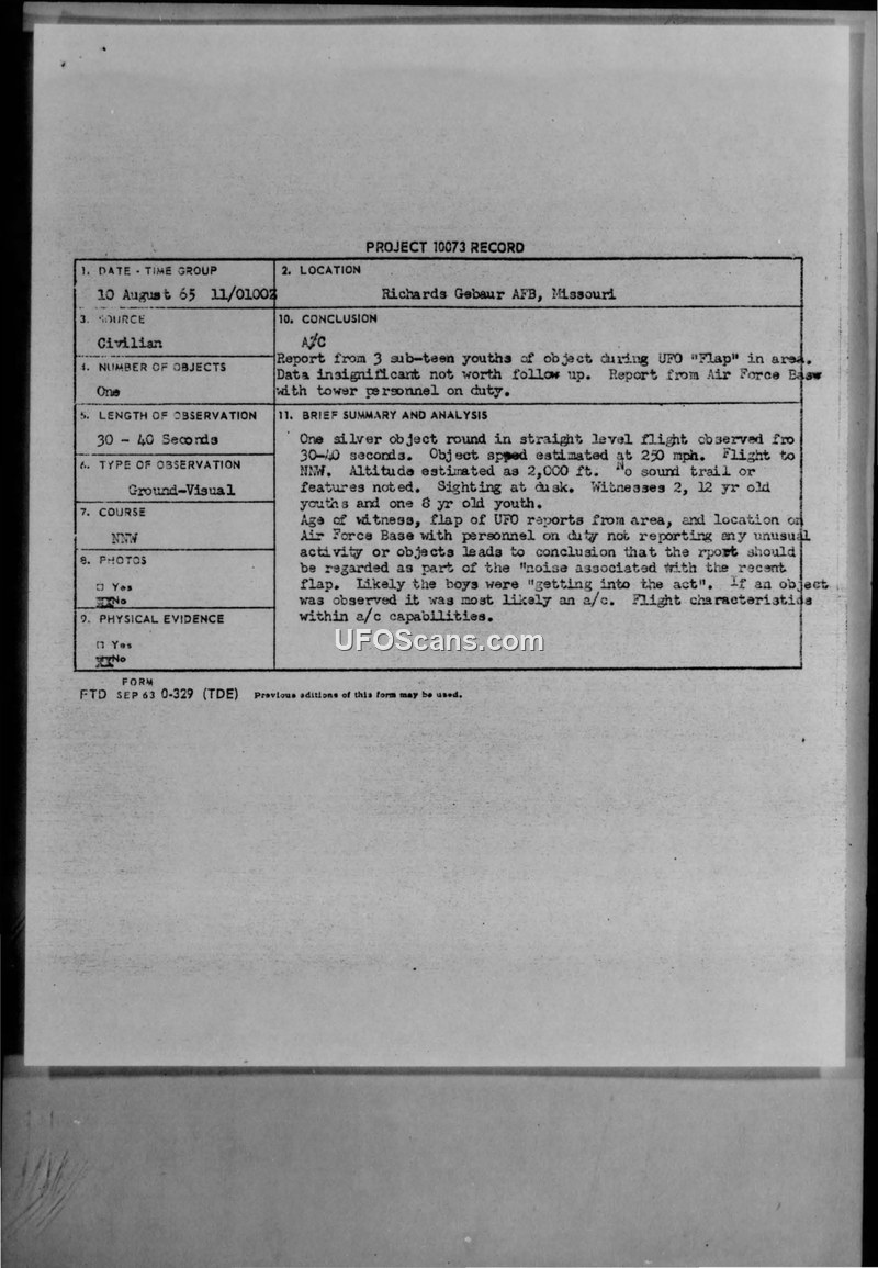 Project 10073 Record: Richards Gebaur AFB Sighting, 10 August 1965