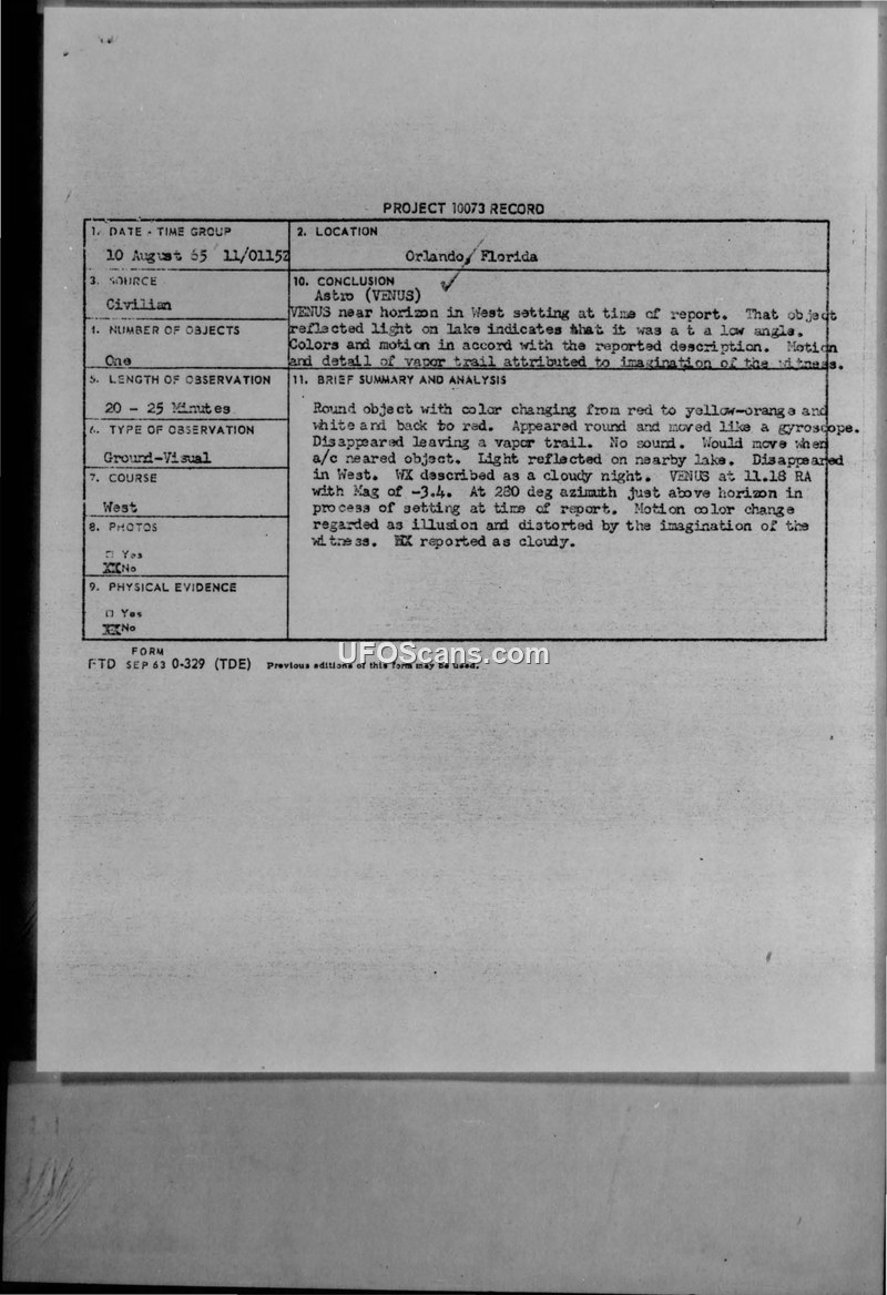 A 1965 sighting of a round, color-changing object in Orlando, Florida, was investigated by the Air Force under Project 10073. The official conclusion identified the object as the planet Venus.