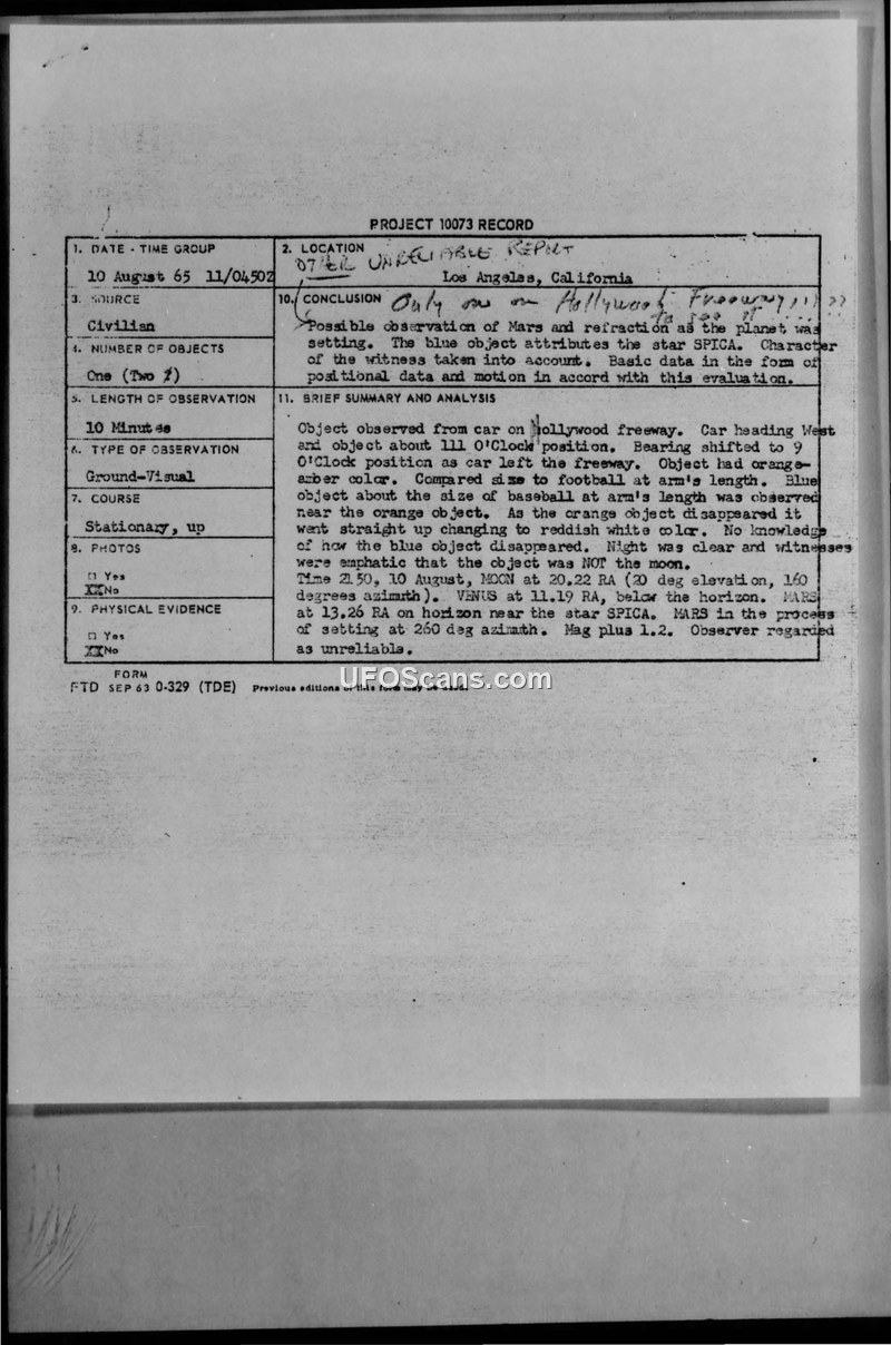 Project 10073 Record — Sighting Report, Los Angeles, California, 10 August 1965