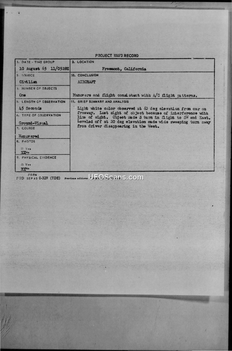 A civilian reported a UFO sighting in Fremont, California, on 10 August 1965, which was investigated by the Air Force. The report includes an 8mm film of the event, which was forwarded to Wright-Patterson AFB for expert analysis.