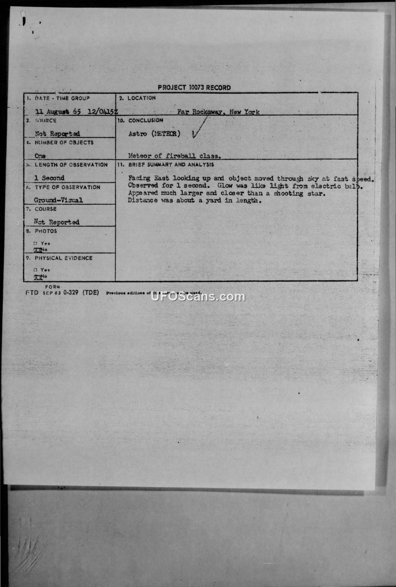 A sighting of a bright object in Far Rockaway, New York, on 11 August 1965 was officially classified by the Air Force as a meteor of the fireball class. The report includes correspondence between the witness and Air Force officials, as well as a referral to Dr. J. Allen Hynek for further review.