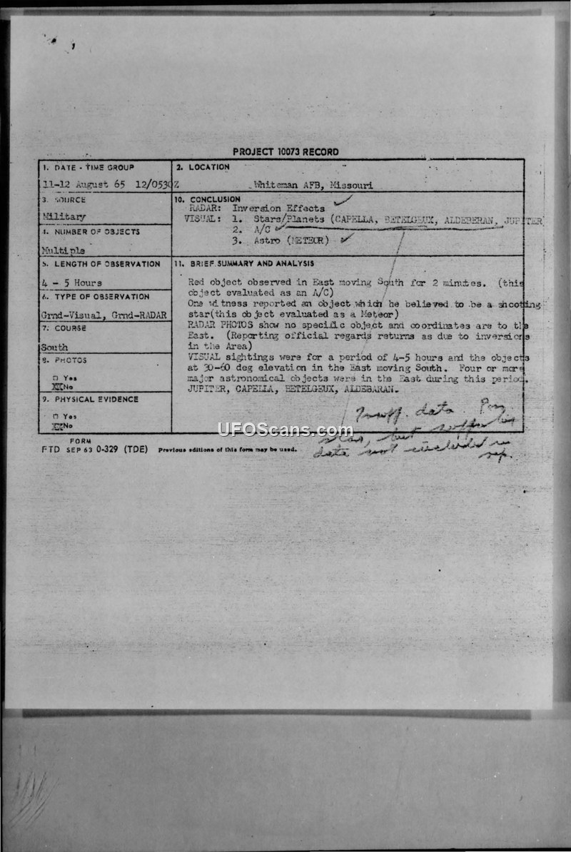 Project 10073 Record - Whiteman AFB, Missouri, 11-12 August 1965