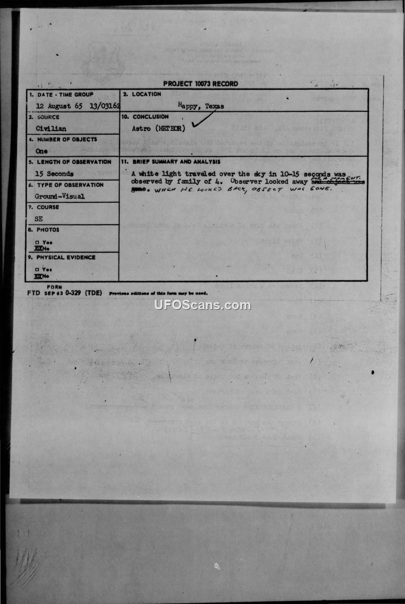 Project 10073 Record — Sighting at Happy, Texas, 12 August 1965
