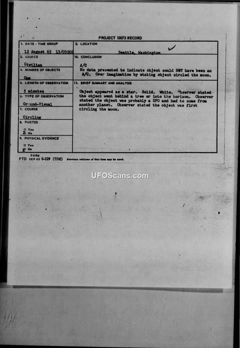 A civilian in Seattle reported a white, star-like object circling the moon on August 12, 1965. The Air Force dismissed the report as lacking evidence and attributed the observation to the witness's imagination.