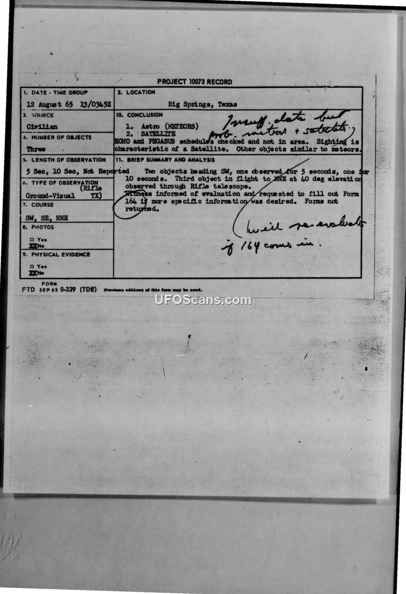 On August 12, 1965, an individual identified as Mangum, associated with the Bemo Tool Crib at WEBP AFB, reported observing three unidentified flying objects in Big Springs, Texas. The observations occurred at 2145, 2200, and 2230 local time. The first two objects were reported heading southwest, with durations of 5 and 10 seconds respectively. The third object was observed at 2230, heading north-northeast at a 40-degree elevation, viewed through a rifle telescope; the witness noted that this object 'looked like satellite.' The report was evaluated by the Air Force, specifically the Deputy for Technology and Subsystems. Official analysis involved checking the schedules of the ECHO and PEGASUS satellites, which did not account for the sightings at the reported times. However, the investigating officer, Major H. Quintanilla, Jr., concluded that the 2230 observation was characteristic of a satellite, while the earlier sightings were tentatively identified as meteors. The witness was sent FTD Form 164 to provide further details, but the forms were never returned to the office.
