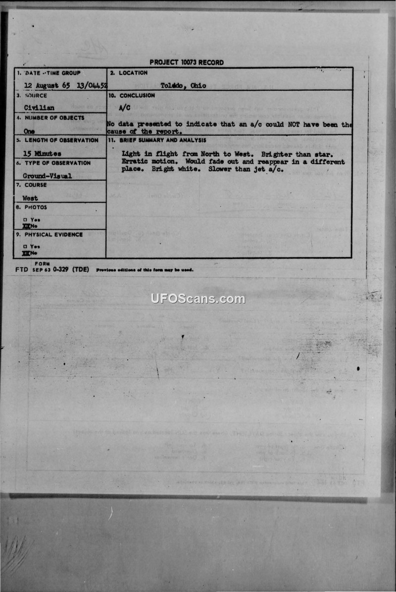 A 16-year-old witness in Toledo, Ohio, reported a 15-minute sighting of an erratic, bright white light on August 12, 1965. The Air Force concluded that the data did not rule out a conventional aircraft.