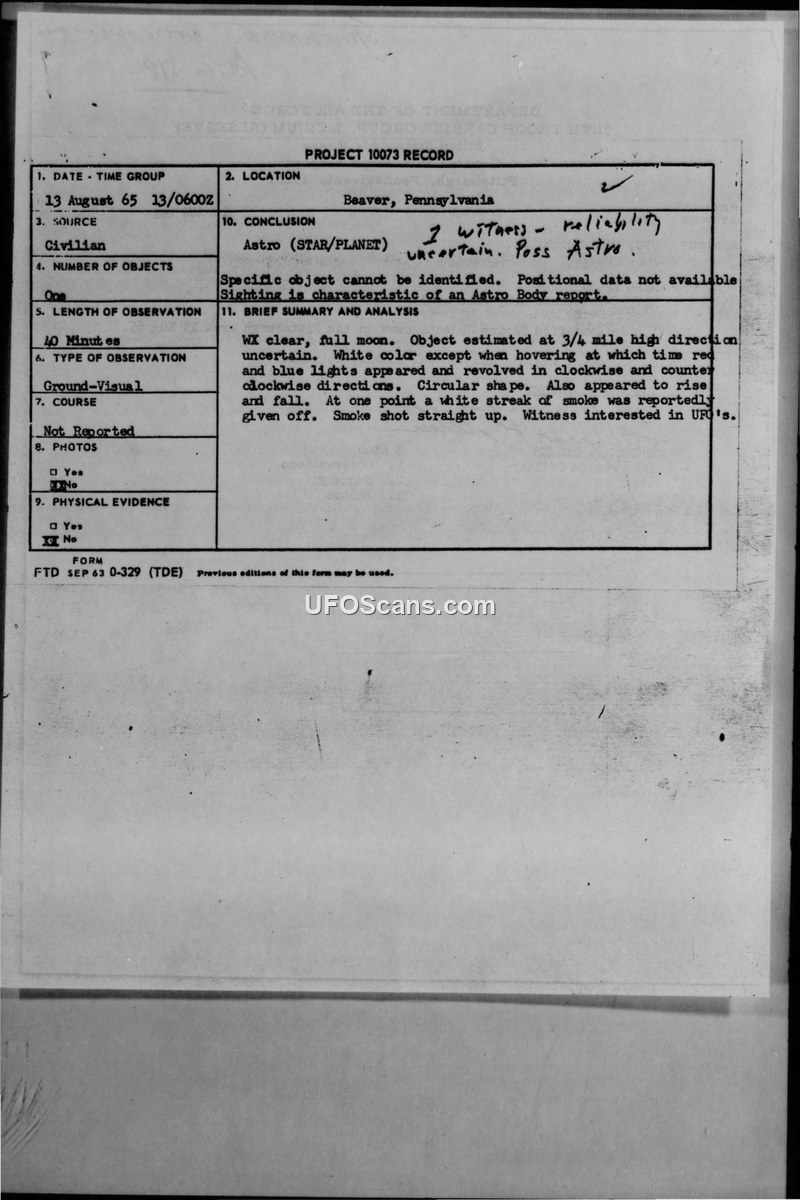 Project 10073 Record — Beaver, Pennsylvania, 13 August 1965