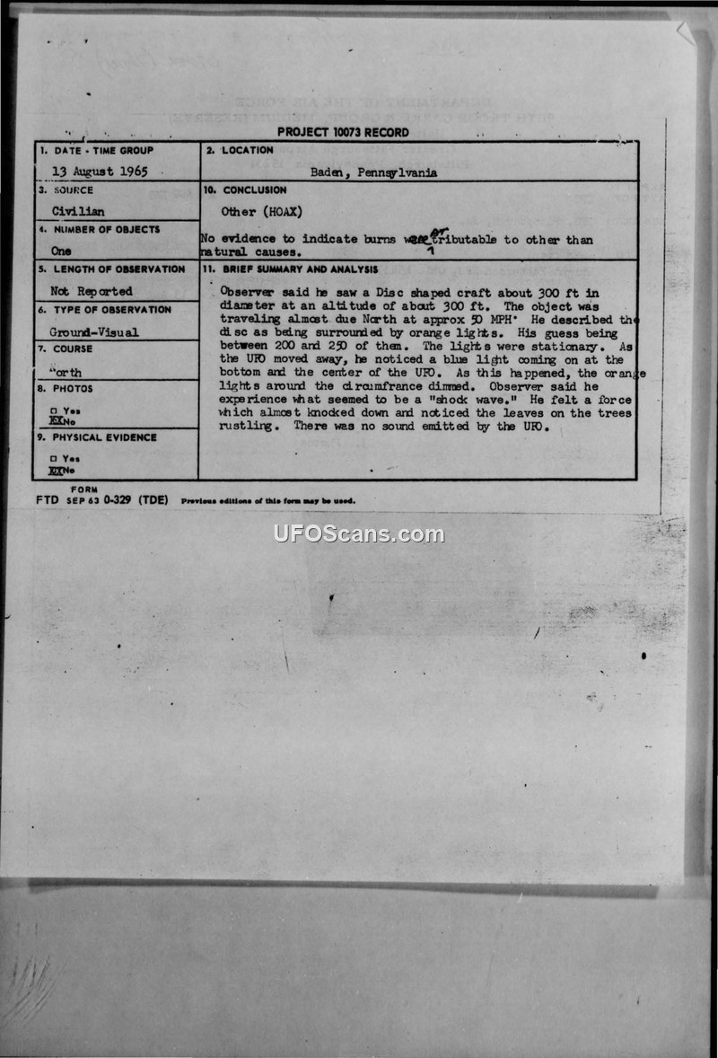 Project 10073 Record — Pittsburgh Area Sightings, August 1965