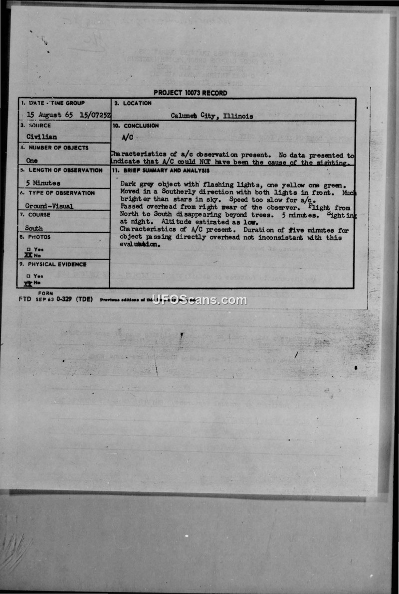 A civilian reported a saucer-shaped object with flashing lights over Calumet City, Illinois, on 15 August 1965. The Air Force investigation concluded the sighting was undetermined.