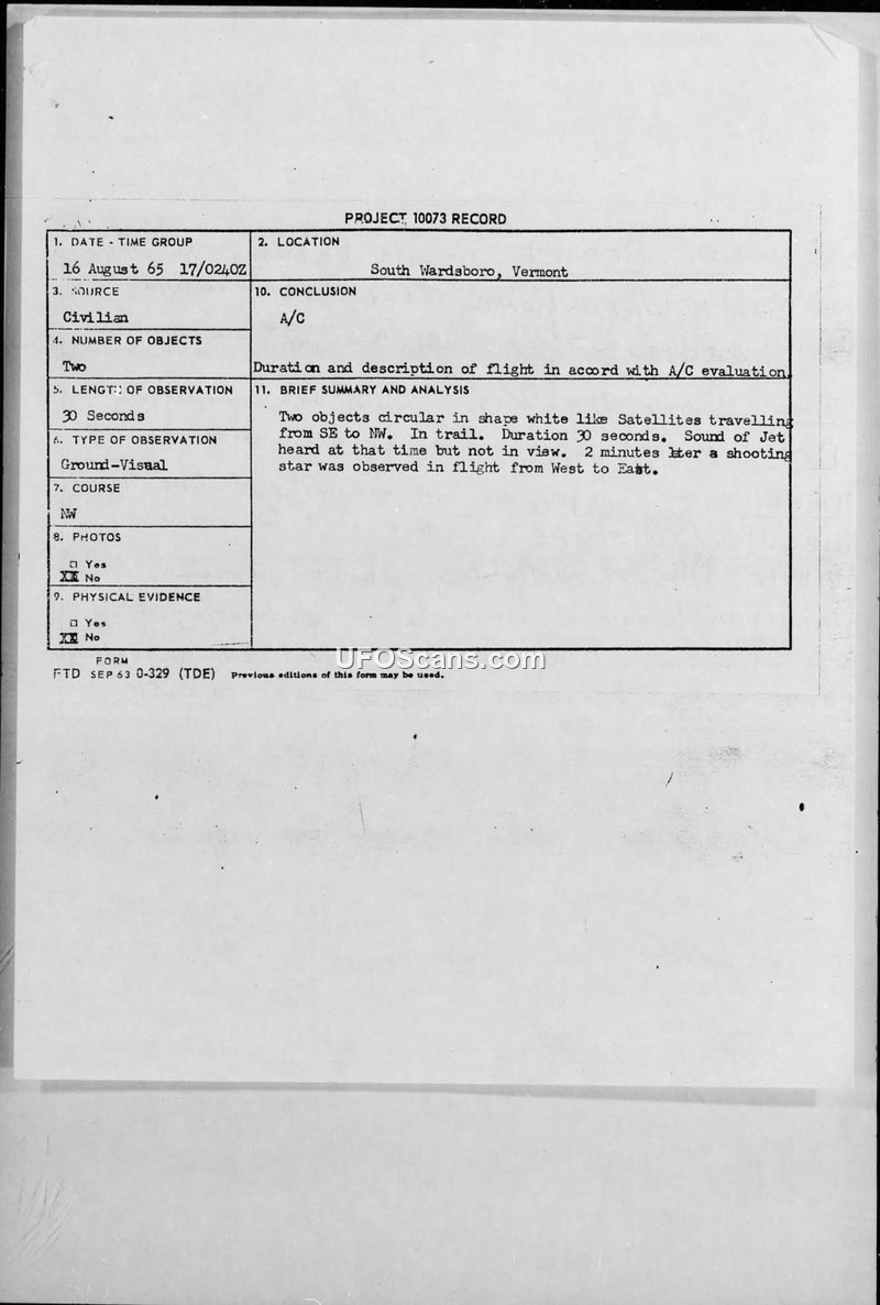 PROJECT 10073 RECORD — South Wardsboro, Vermont, 16 August 1965
