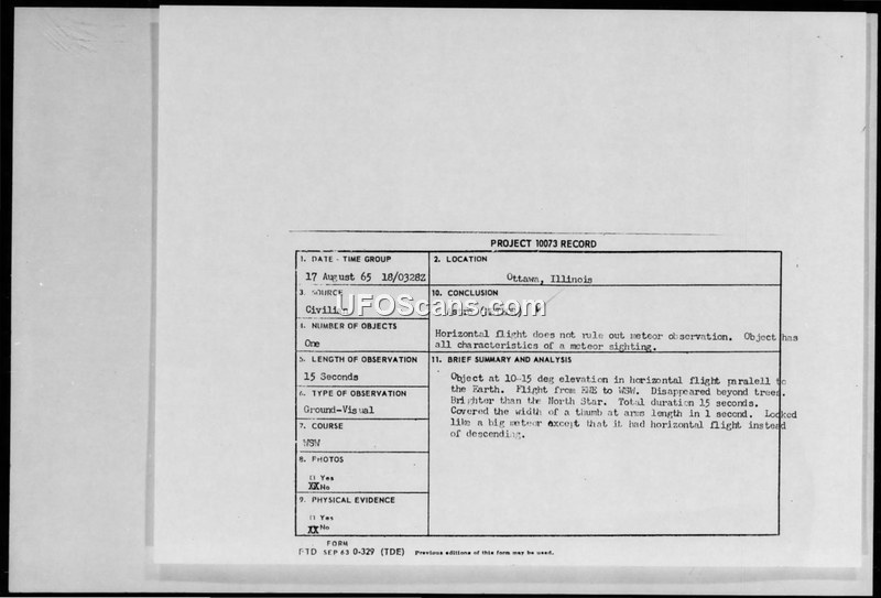 A civilian report of an aerial object in Ottawa, Illinois, on August 17, 1965, was officially evaluated by the Air Force as a meteor. The conclusion was based on the object's flight path and speed, which were inconsistent with known satellite characteristics.